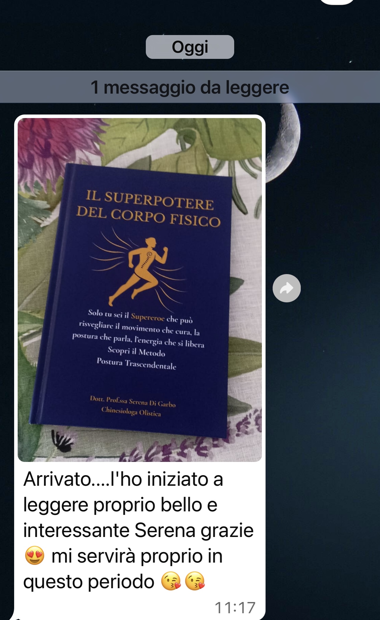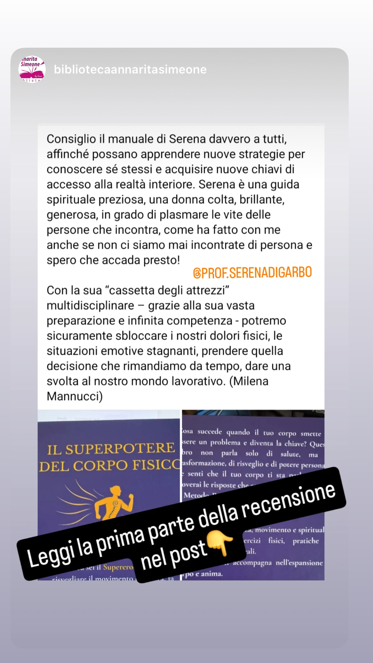 “Mi piace molto la parola “postura” perché Serena riesce a declinarla in molteplici sfaccettature: non solo fisica, ma anche psichica, emotiva, karmica. Il cammino che ci porta ad esplorare questi mondi interiori è un viaggio da cui si torna cambiati, l’ho sperimentato sulla mia pelle...[].. Consiglio il manuale di Serena davvero a tutti, affinché possano apprendere nuove strategie per conoscere sé stessi e acquisire nuove chiavi di accesso alla realtà interiore. Serena è una guida spirituale preziosa, una donna colta, brillante, generosa, in grado di plasmare le vite delle persone che incontra, come ha fatto con me anche se non ci siamo mai incontrate di persona e spero che accada presto!